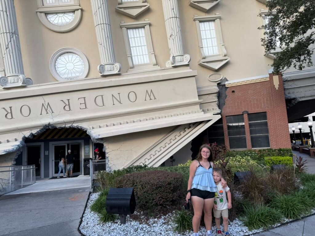 We arrive at WonderWorks Orlando — the upside-down building invites curiosity before we even step in.